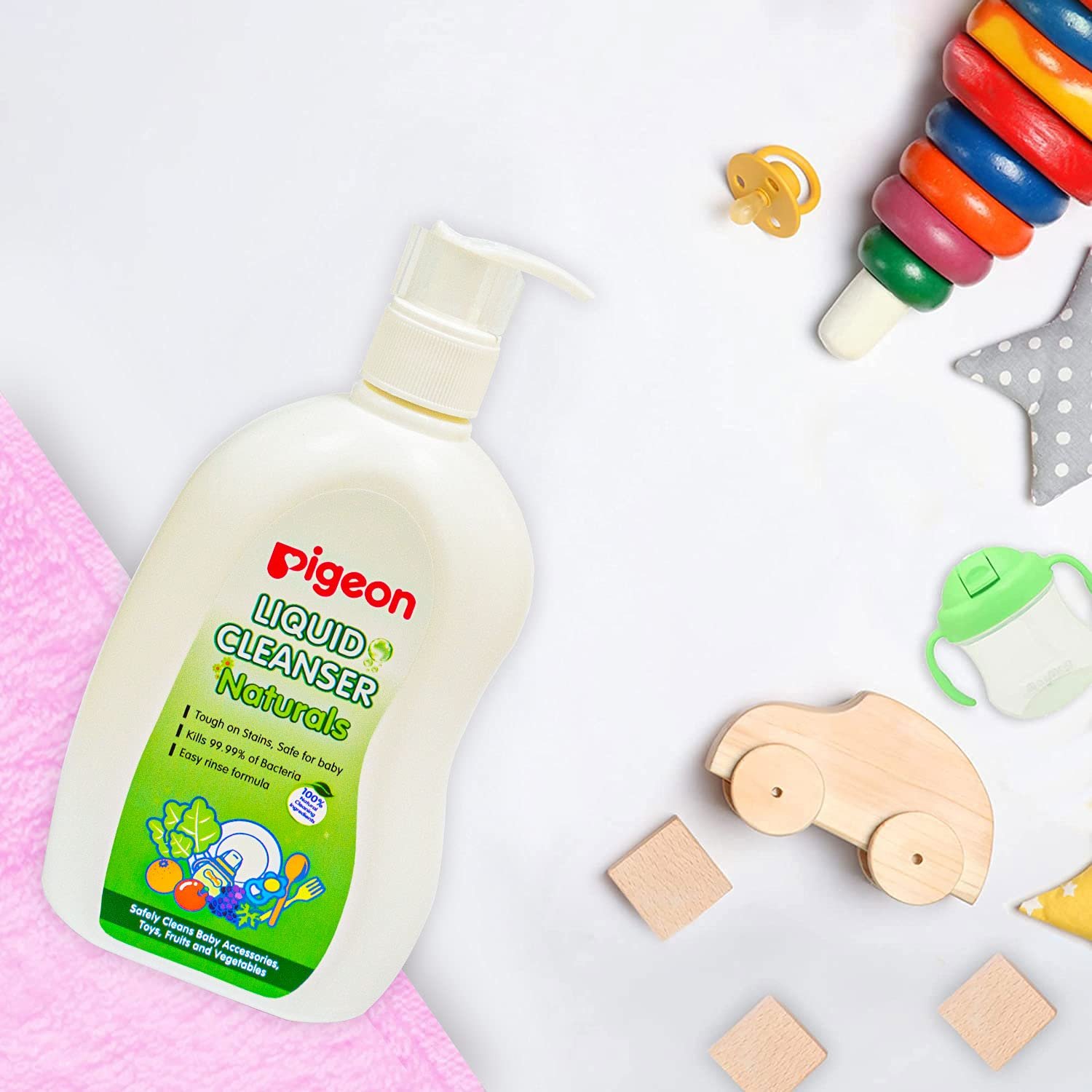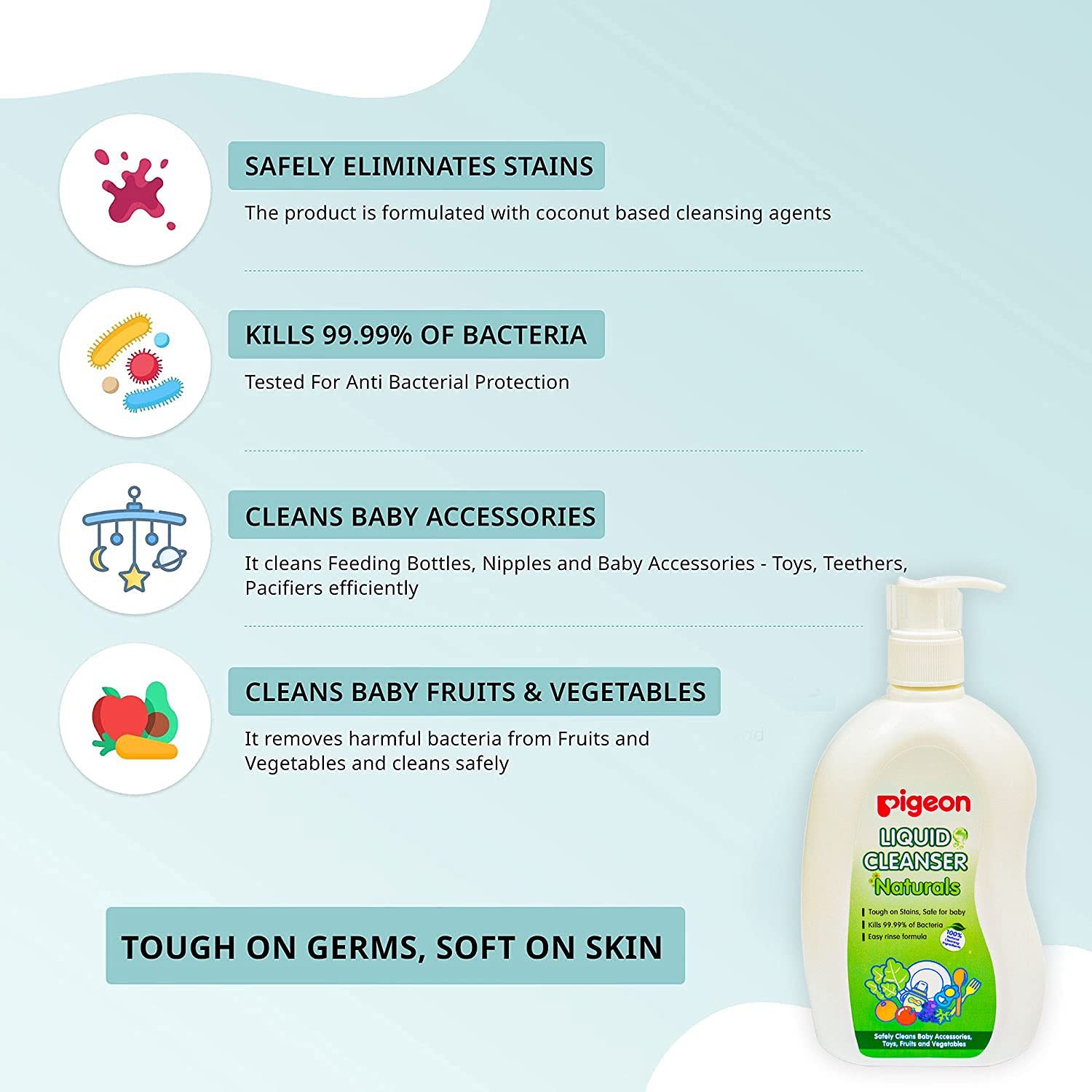 Pigeon Baby Liquid Cleanser Naturals is coconut-based and ideal for cleaning bottles, pacifiers, and other baby essentials. This Baby Liquid Cleanser is skin-friendly, color-free, alcohol-free, and dermatologically tested, offering 99.99% protection from germs. It rinses easily, ensuring convenience for busy parents.