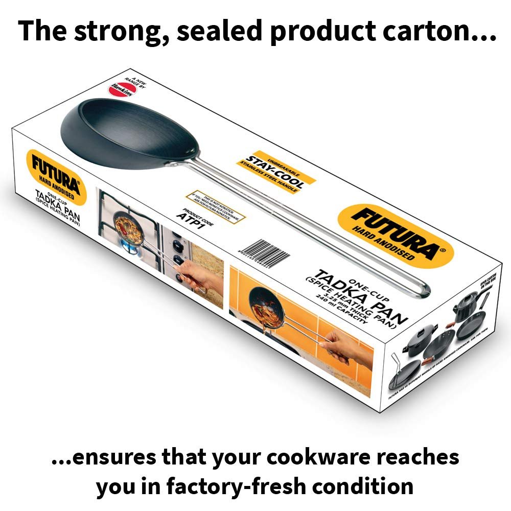 The extra thickness of the Futura Hard Anodised Frying Pans helps you cook without burning with minimal heat control. The instruction manual which comes with each frying pan gives easy tips for use and care as well as recipes. The handles, whether plastic or stainless steel, are stay-cool and comfortable. The Tadka Pan (Spice Heating Pan) is designed for quick heating of flavourful spices and is also useful for melting butter or reheating small quantities of food.