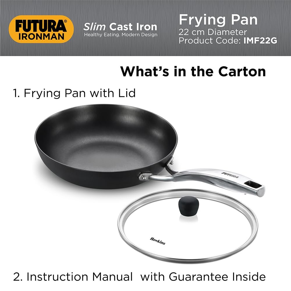 The Hawkins Futura Ironman 22 cm Slim Cast Iron Frying Pan with Glass Lid (IMF22G) combines the strength of cast iron with a lighter, easy-to-handle design. Made with nitrided iron, it has a hardened surface that resists abrasion, is corrosion-resistant, and less likely to rust. Its low-porosity surface needs less oil, while the non-reactive finish ensures food retains its natural taste. Perfect for searing, stir-frying, cutlets, or omelettes, this pan withstands high heat without damage. The included glass lid lets you cook covered and retain moisture. Built to last for years, this slim cast iron frying pan is durable, versatile, and designed for healthy everyday cooking.