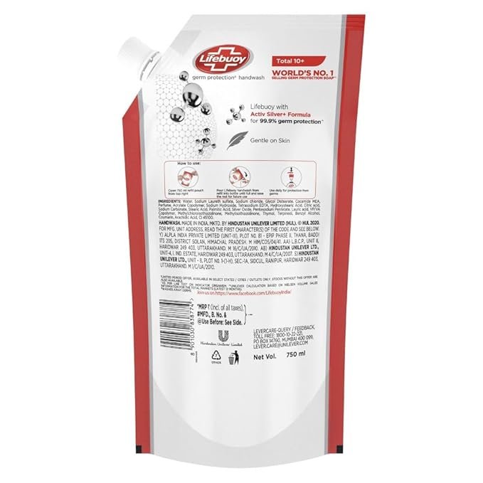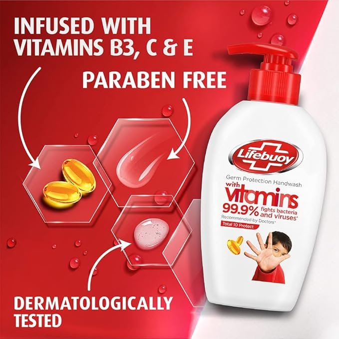 Lifebuoy Handwash makes hand washing quicker and more effective than ever before! Lifebuoy Total 10 Germ Protection Hand Wash contains our patented ingredient|| Activ Naturol Shield|| ensuring your hands are clean and protected against germs. The special formula is proven to remove 99.9% of germs in just 10 seconds and designed to give you the protection you and your family need. The handwash prevents the spread of germs|| keeping the family safe from 10 infection causing germs. It will leave your skin feeling protected|| cleansed and refreshed. Lifebuoy Hand Washes are approved by Royal Society of Public Health|| London. Usage directions for best results: Take a few drops of the handwash|| add water and rub the hands together to create foam and lather. Rub the back of your hands as well as your fingertips and nails. Rinse with water and dry with a clean cloth. The germs can be removed in just 10 seconds. As per lab test. Washing with soap & water is a recommended measure to help prevent transmission of infection causing germs. Our Story: Lifebuoy started with William Lever’s goal to stop cholera in Victorian England. Over the past century|| we’ve evolved into the world’s #1 selling germs protection soap and a worldwide leader bringing better health and hygiene to billions.